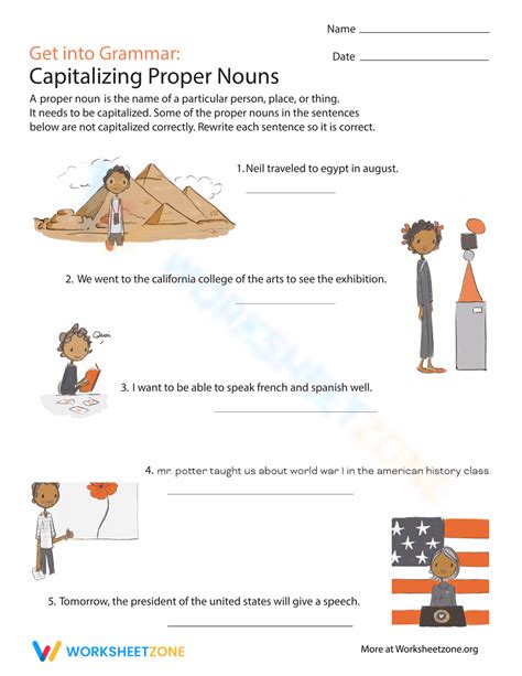 This common and proper nouns worksheet guides kids to improve their writing skills. In this worksheet, children will read five sentences, then rewrite them using the correct. Underline each letter that should be capitalized.